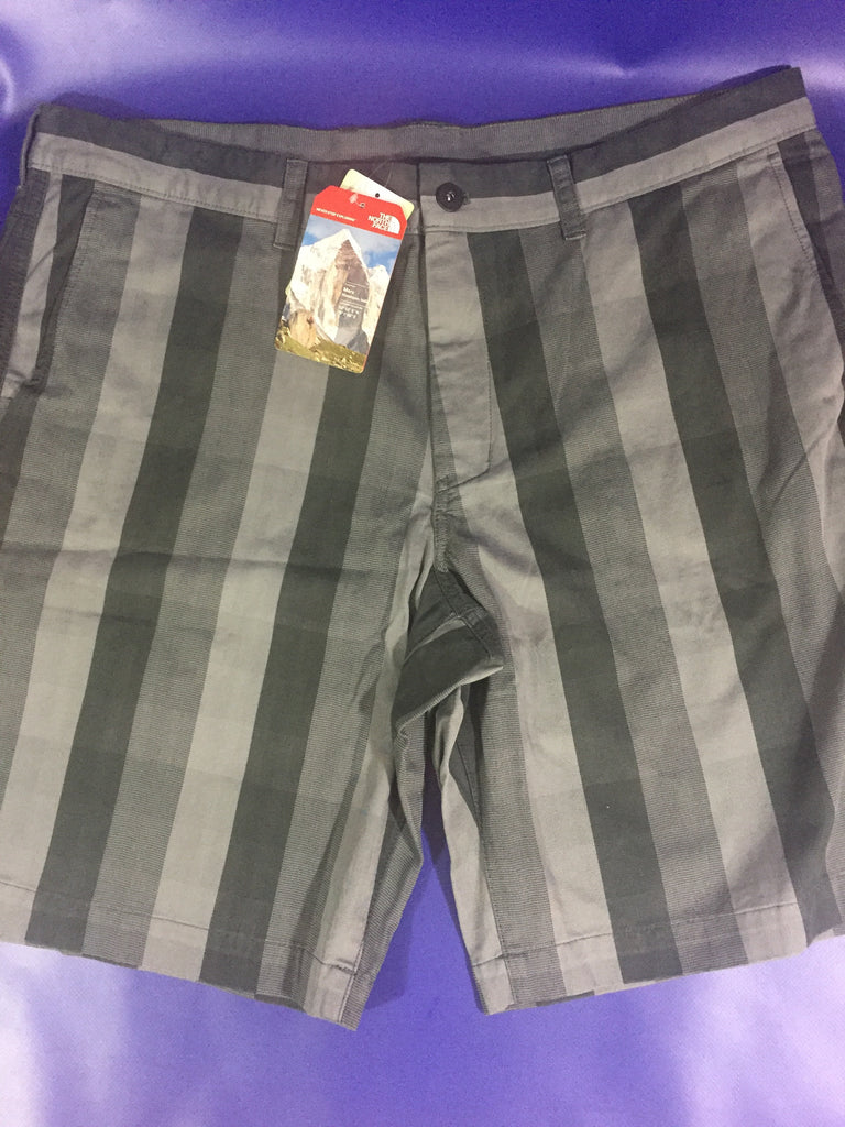 Men’s 40W The North Face Shorts. Color Gray Striped. Item is new with Tags. Stretch Comfort. Double back pocket with zipper.